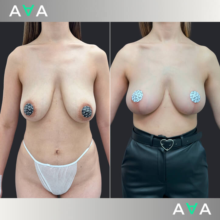 Мы провели Т-подтяжку (якорный разрез), чтобы убрать излишки кожи и поднять грудь, и установили анатомические импланты для восстановления пышного, но естественного объема.